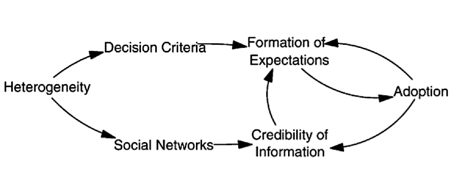 Moreover another important change occurs as the technology diffuse over time and across adopters categories. The focus of the technology adoption decision systematically shifts, pivoting from abstract technological merit to concrete, risk-mitigating market factors:
